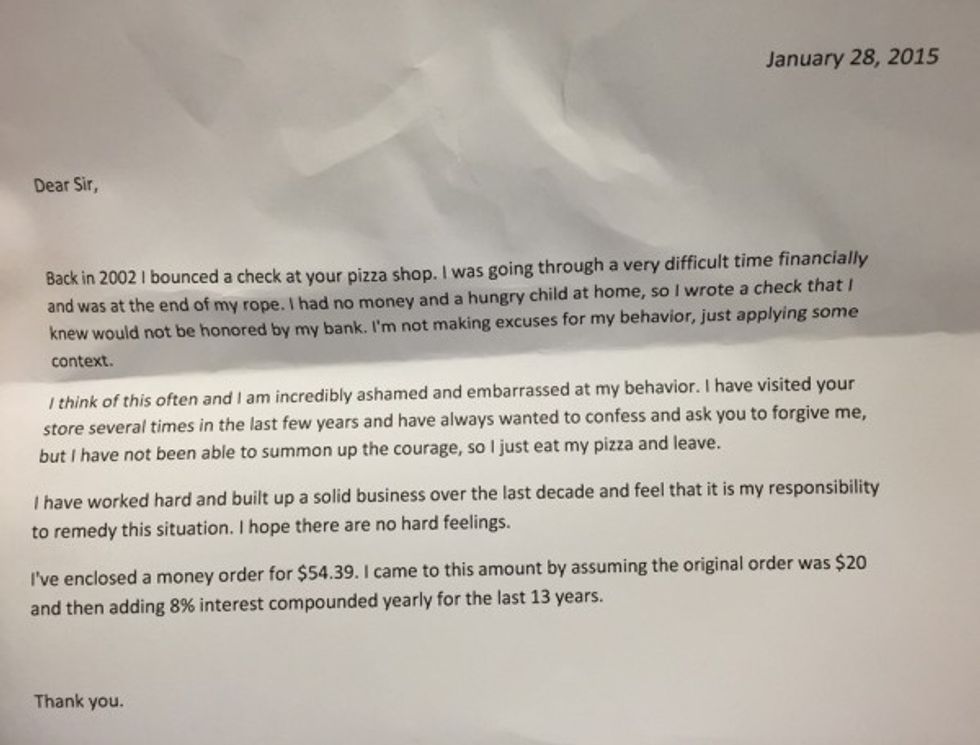 "I think of this often and I am incredibly ashamed and embarrassed at my behavior. I have visited your store several times in the last few years and have always wanted to confess and ask you to forgive me, but I have not been able to summon up the courage, so I just eat my pizza and leave."