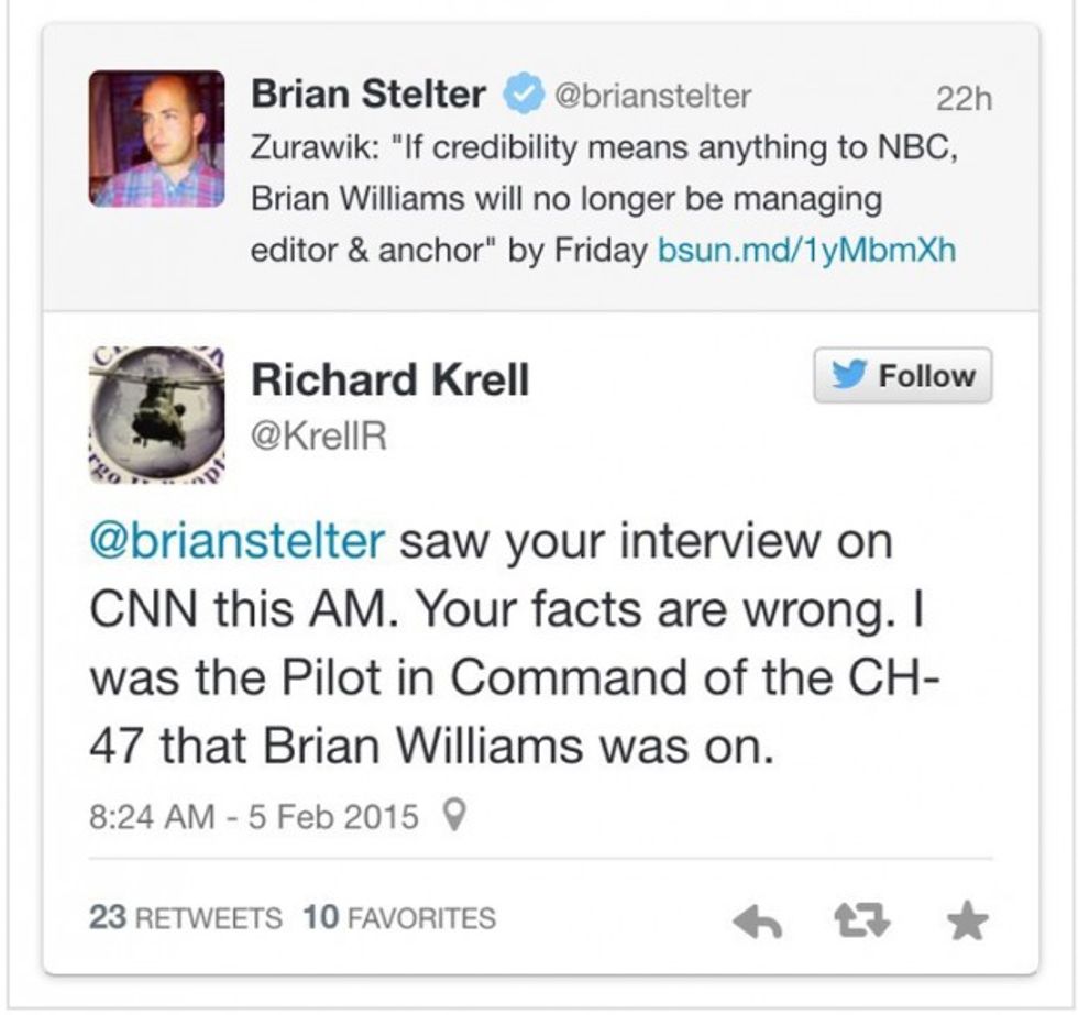 "[S]aw your interview on CNN this AM. Your facts are wrong," Krell tweeted to Stelter. "I was the Pilot in Command of the CH-47 that Brian Williams was on."