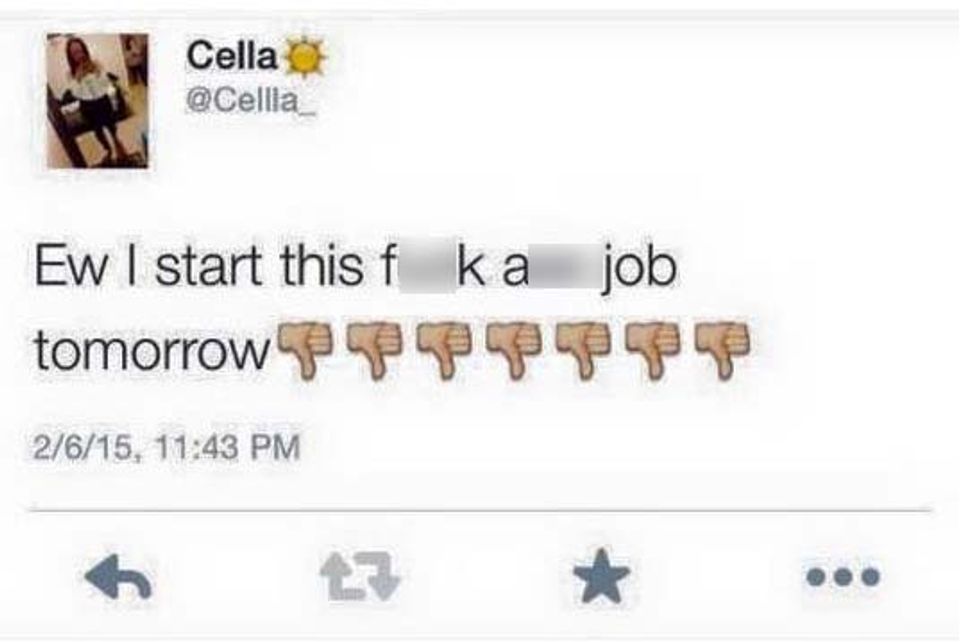 "Ew I start this f**k a** job tomorrow," Cella tweeted Friday night.