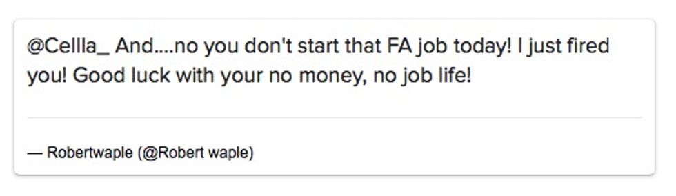 "[N]o you won't start that FA job today! I just fired you! Good luck with your no money, no job life!" he said.