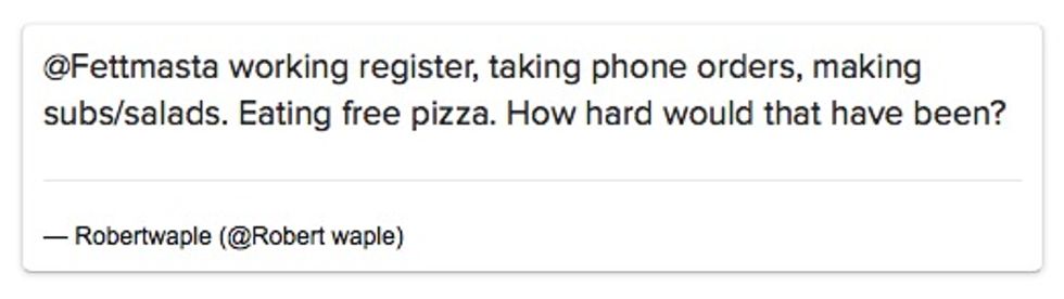 "[W]orking register, taking phone orders, making subs/salads. Eating free pizza. How hard would that have been?" he added in a followup tweet.