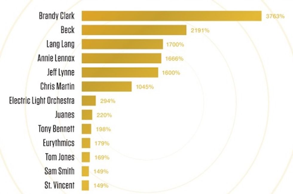 His increase, however, paled in comparison to country music singer Brandy Clark: The day after Sunday's Grammy telecast, Clark's music saw a stunning 3,763 percent jump in traffic on Pandora.