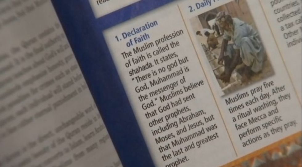 The textbook in question is titled "World History" by publisher Prentice Hall. WFTV has more on the content in the chapter on Islam: