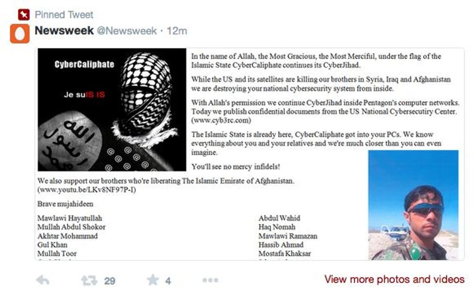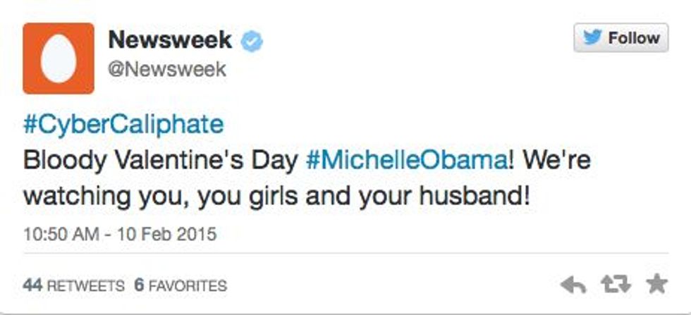 Hackers posted several tweets and changed the account's background to read "Cyber Caliphate" and "Je suIS IS." Control of the account was restored after 15 minutes, according to a statement from Newsweek. Hackers gained control of the account at 10:45 a.m. and Newsweek said it regained access at 10:59.