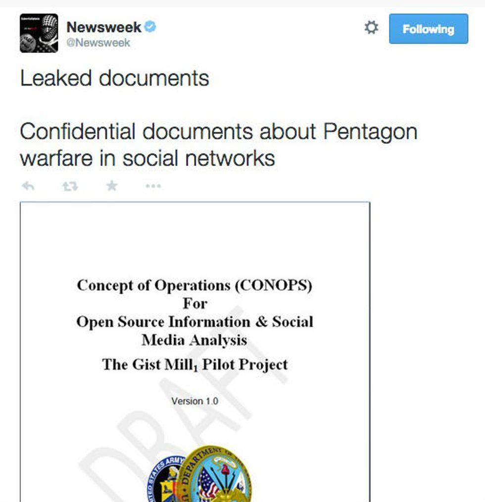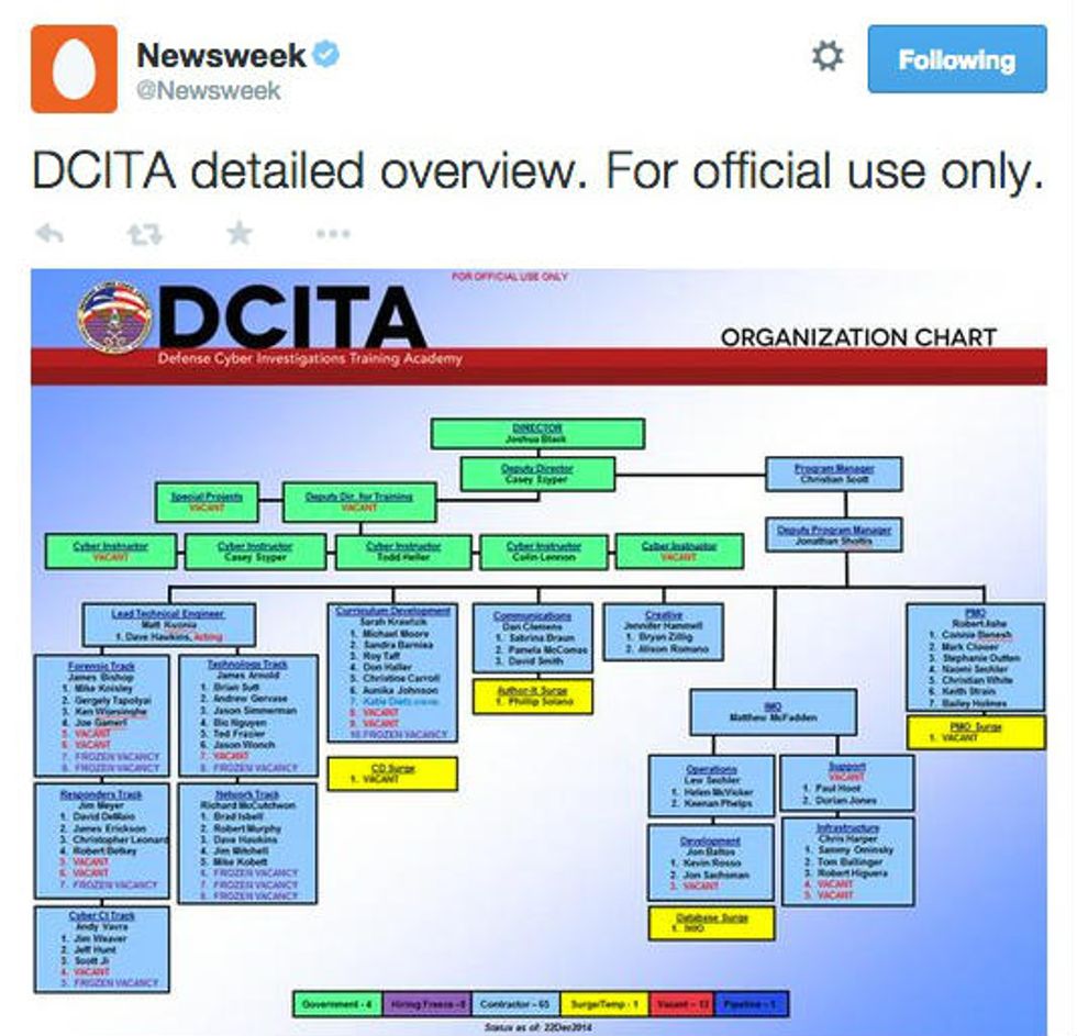 "While the U.S. and its satellites are killing our brothers in Syria, Iraq and Afghanistan we are destroying your national cybersecurity system from inside," read text in the photo of another tweet issued moments later. "With Allah's permission we continue CyberJihad inside Pentagon's computer networks. Today we publish confidential documents from the U.S. National Cybersecurity Center (www.cyb3rc.com)."