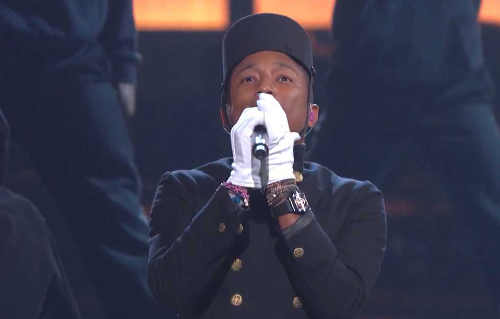 Most reports on Pharrell’s performance focused on his choice of outfit and the racially-charged “hands up, don’t shoot” gesture he included in his act. He also had some dancers in hoodies in reference to the shooting of Trayvon Martin.