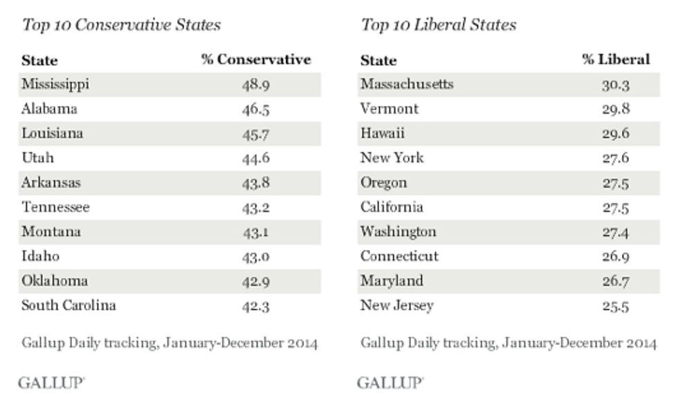 Conservatives outnumber liberals in 47 out of 50 states, according to new data released by Gallup.