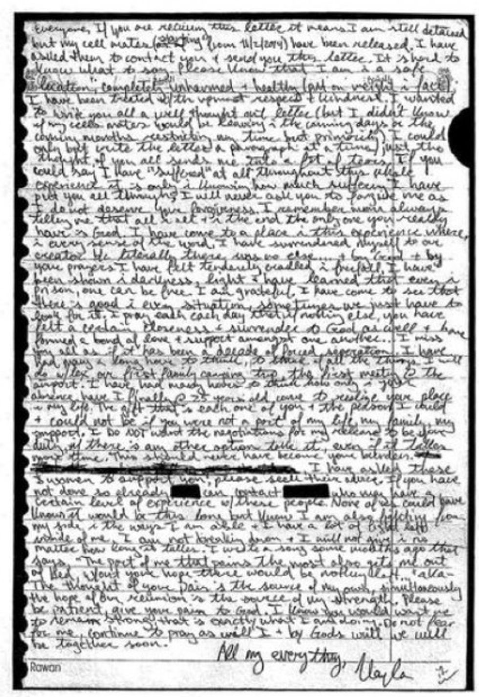 Please know that I am in a safe location, completely unharmed + healthy(put on weight in fact); I have been treated w/ the utmost respect + kindness. I wanted to write you all a well thought out letter (but I didn’t know if my cellmates would be leaving in the coming days or the coming months restricting my time but primarily) I could only but write the letter a paragraph at a time, just the thought of you all sends me into a fit of tears.