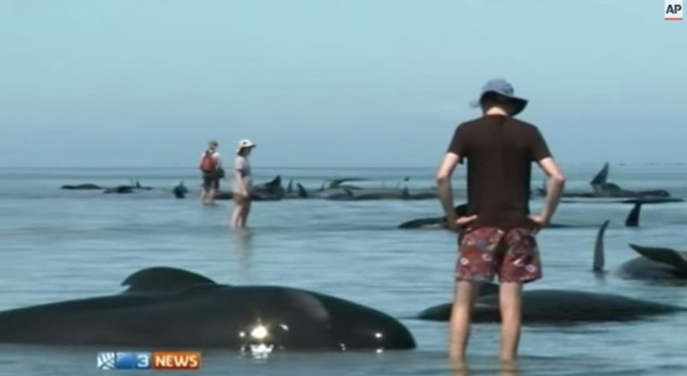 One of hundreds of beached wales dying in New Zealand Friday. (Image via AP/YouTube)