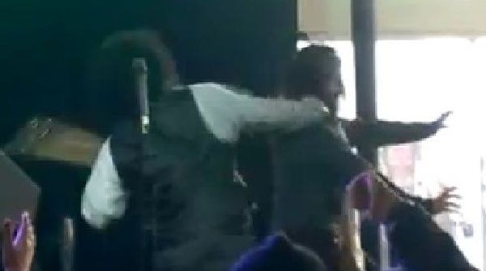 He ignored the woman at first, but when she started dancing on him while he played guitar, the entertainer turned around and viciously punched the woman, knocking her to the ground.
