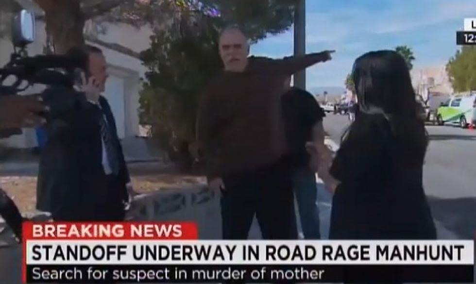 As police and SWAT teams surrounded the home of the suspect in the road-rage killing of a Las Vegas mother on Thursday, the woman’s grieving husband exploded on members of news crews who had set up at the scene.