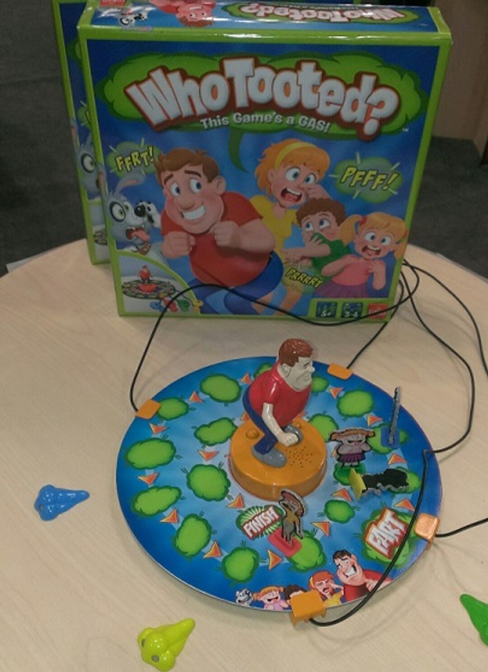 Mixed in among standards and classics like Apples to Apples and Chutes and Ladders were several games that many would find offensive. Topping the list of bottom-feeders: "Who Tooted?" (complete with a little plastic bent-over man with a pffft-ing sound effect) and "Poopyhead" (anyone in for some cartoonish plastic poo?). By the way, this poo-ticular company hails from Rotterdam.