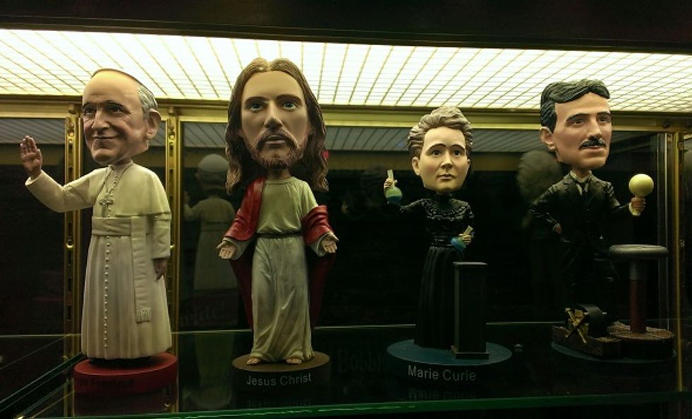 A bobblehead manufacturer included both the famous and infamous in its collection. On the upper-most shelf were the highest echelon of achievers — and Jesus was right there, bobbing his head along with the pope to his right and Marie Curie and Nikola Tesla to his left. (We looked and looked but could not find the bobble head of the Prophet Muhammad.)
