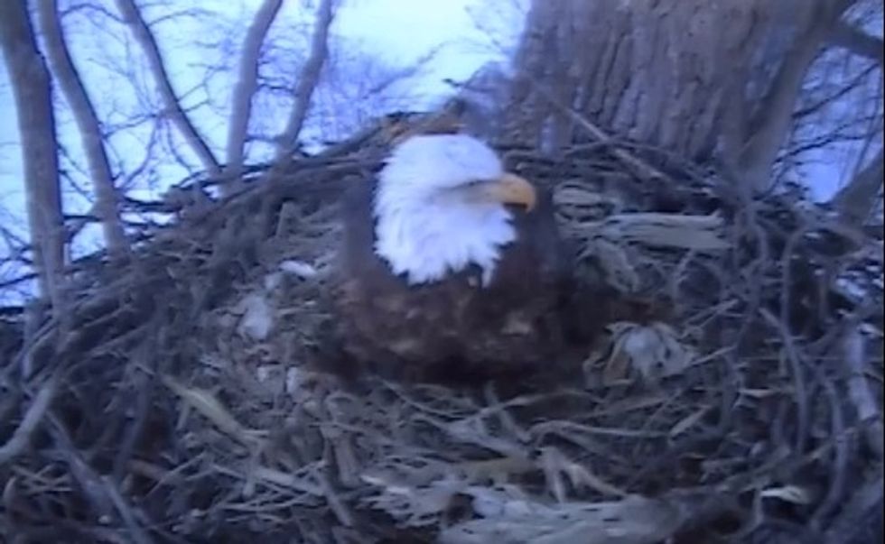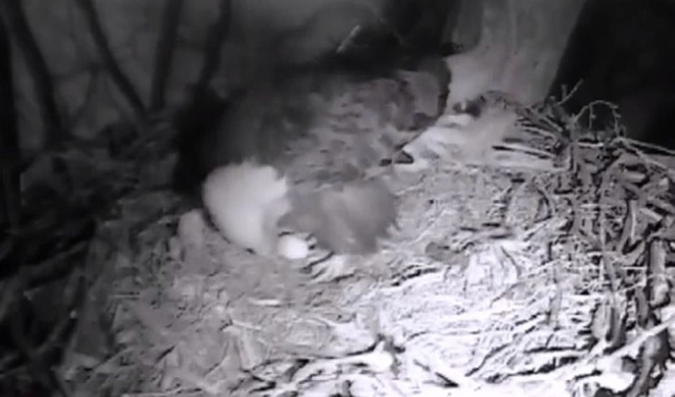 This same eagle's live stream became notorious last month when a pair of horned owls attacked the nest, leading to a battle for the territory. Here's that video: