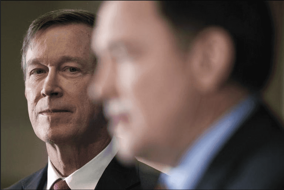 National Governors Association Chairman, Colorado Gov. John Hickenlooper listens at left as Vice Chair, Utah Gov. Gary Herbert, speaks at the opening news conference of the National Governors Winter Meeting in Washington, Saturday, Feb. 21, 2015. (AP Photo/Cliff Owen)