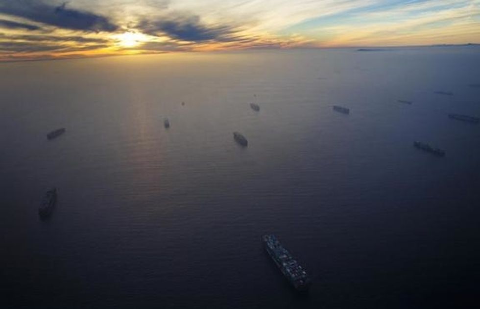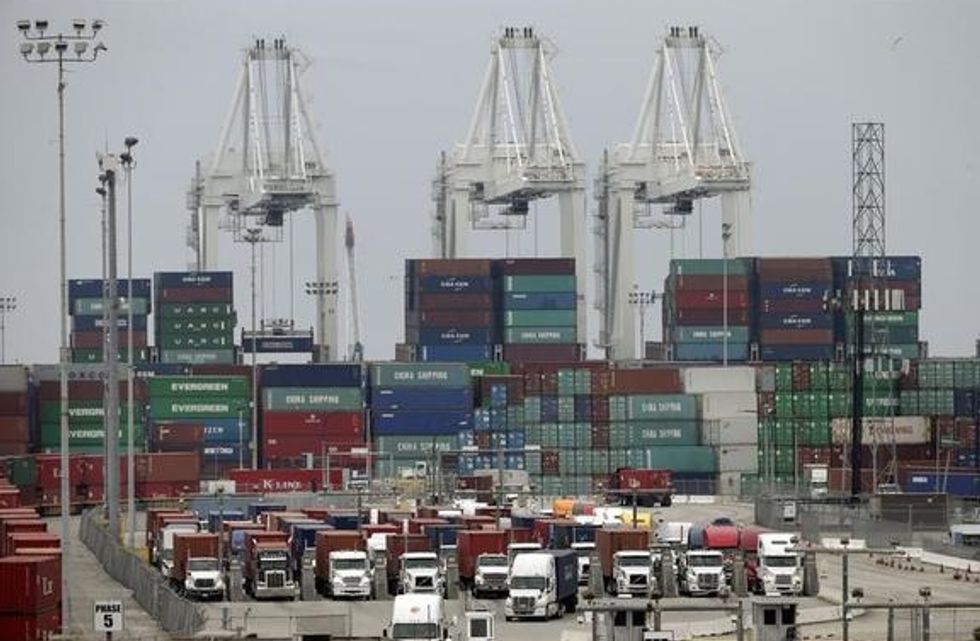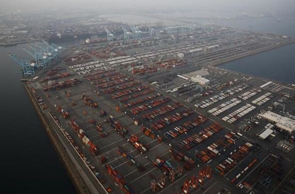 Shipping containers and trucks sit on the dockside in this aerial photograph taken above the Port of Los Angeles in Los Angeles, California, U.S., on Wednesday, Feb. 18, 2015.(Bloomberg/Bloomberg via Getty Images)
