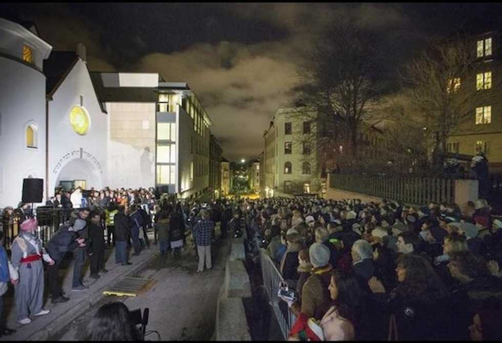More than 1,000 people formed a "ring of peace" around the Norwegian capital's synagogue, an initiative taken by young Muslims in Norway after a series of attacks against Jews in Europe, in Oslo, Saturday, Feb. 21 2015. (AP Photo/Hakon Mosvold Larsen / NTB Scanpix)