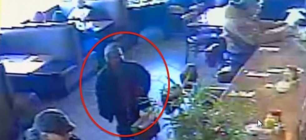 In the surveillance footage, a child, who was with two others kids and two adult women, picked up a pen near the cash register at Alex's Restaurant and wrote "I'm with some people, please help me." While doing so, he looked over his shoulder a couple of times.