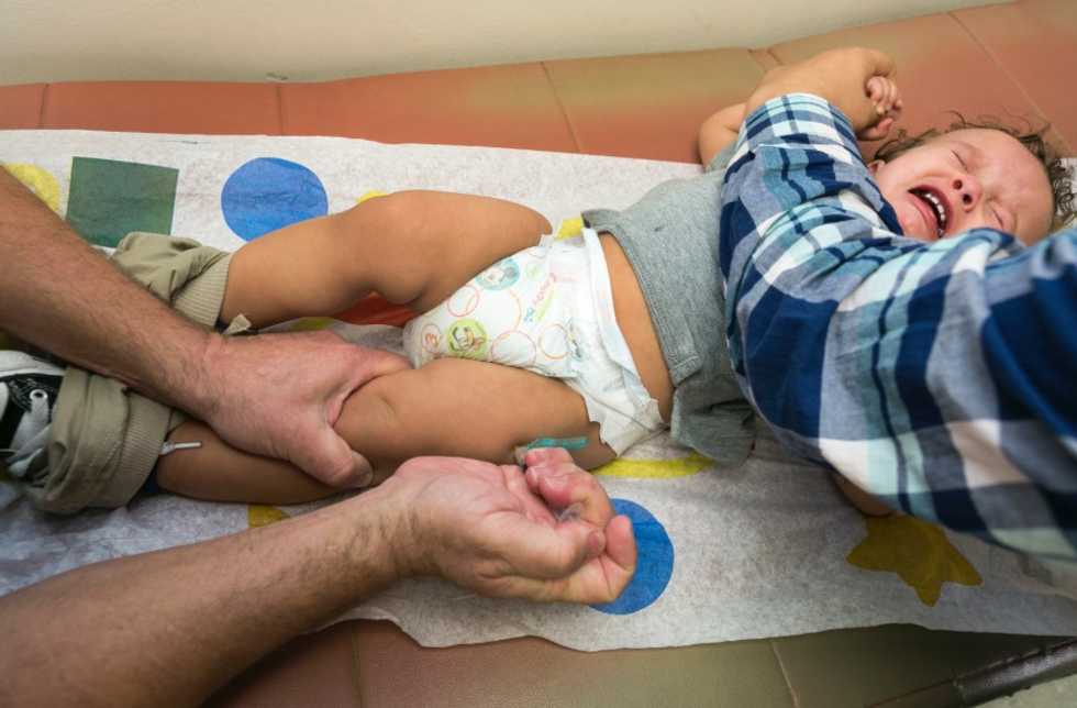In this Jan. 29, 2015, file photo, pediatrician Dr. Charles Goodman vaccinates 1 year- old Cameron Fierro with the measles-mumps-rubella vaccine, or MMR vaccine at his practice in Northridge, Calif. (AP/Damian Dovarganes)