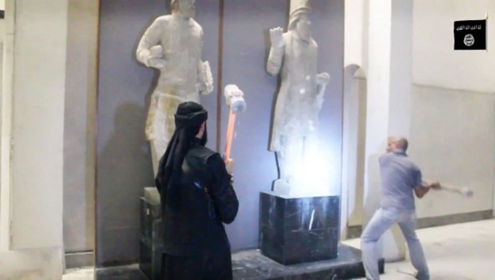One of the men could be seen beheading a statue, an image chillingly reminiscent of recent videos the hardline Islamist group has posted showing the execution of hostages.
