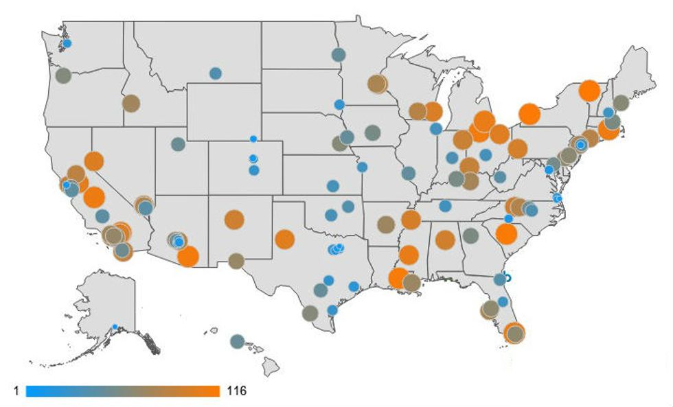 The survey also revealed changes in labor participation rates by cities in every state from 2007-2013. The below map is a color-coded time lapse of those data: