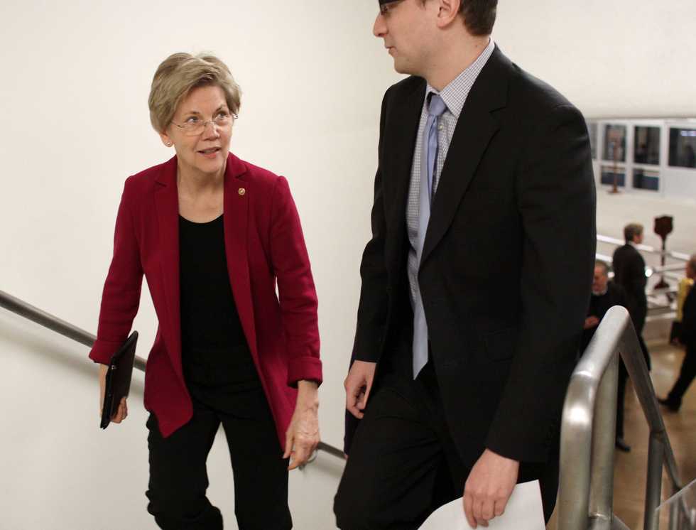 Sen. Elizabeth Warren, D-Mass. speaks to a staff member on Capitol Hill in Washington, Wednesday, Feb. 25, 2015, as Democrats and Republicans headed to their party caucus meetings to discuss the homeland security funding. (AP Photo/Lauren Victoria Burke)