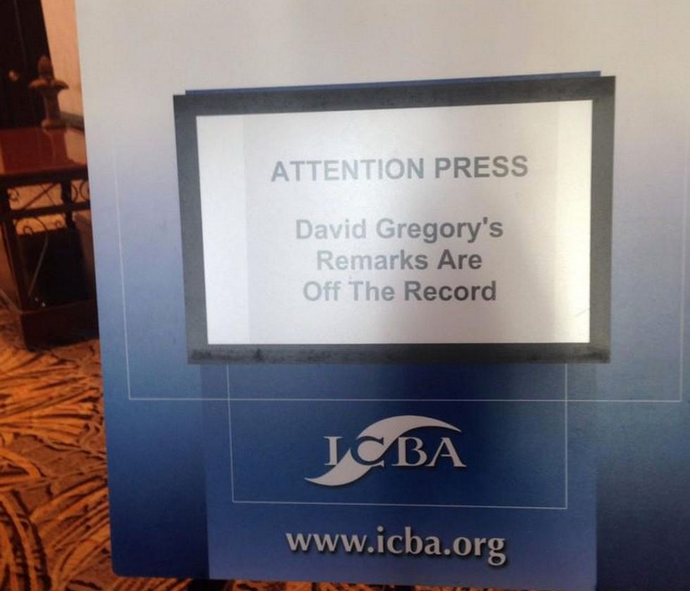 Fired "Meet the Press" host David Gregory gave an "off the record" speech at an Independent Community Bankers of America conference on Wednesday, but his remarks didn't stay "off the record" for long.