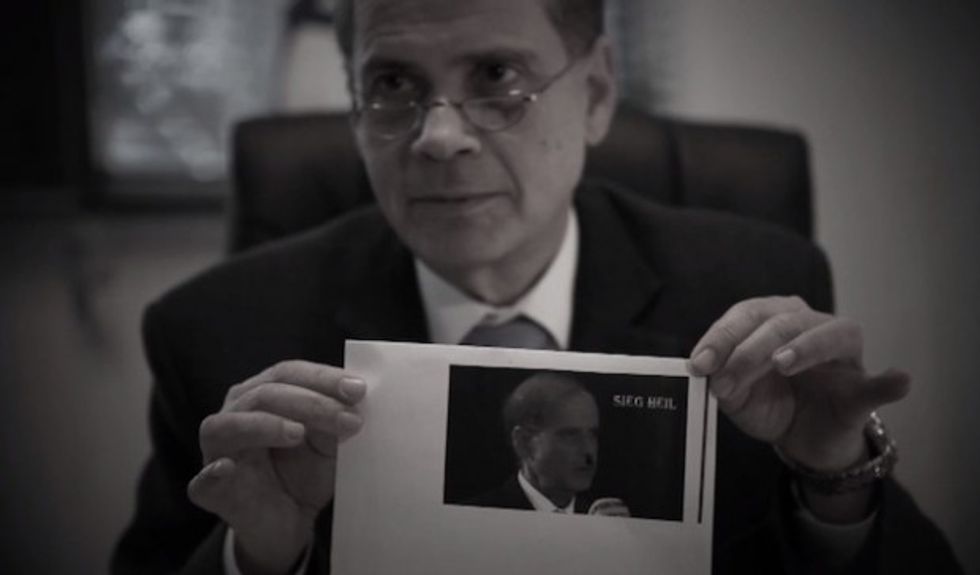 Israeli Ambassador Yakov Hadas-Handelsman holds up one photo he received of Hitler along with the Nazi phrase "Sieg Heil." (Image source: YouTube)