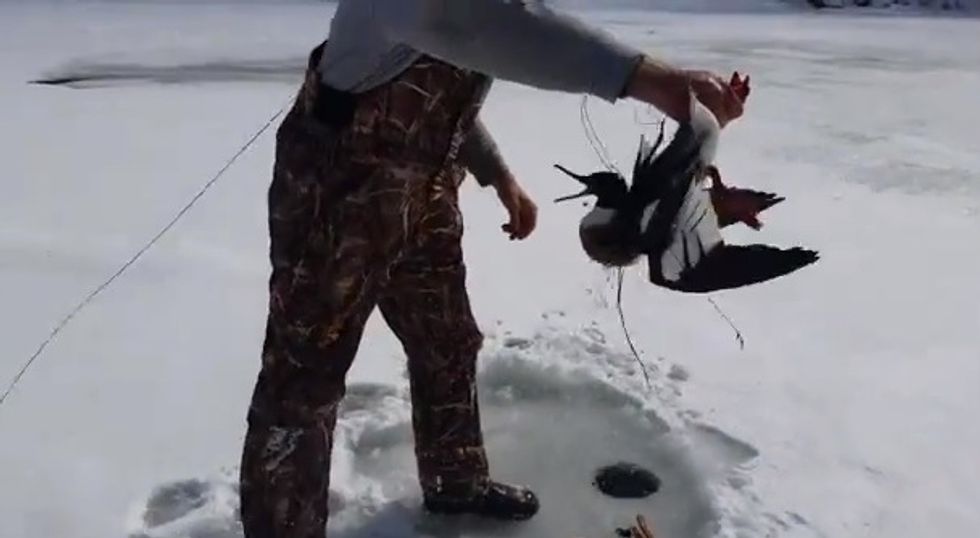 Instead of a fish, plant debris or an old shoe, the men appear to have caught a live duck.