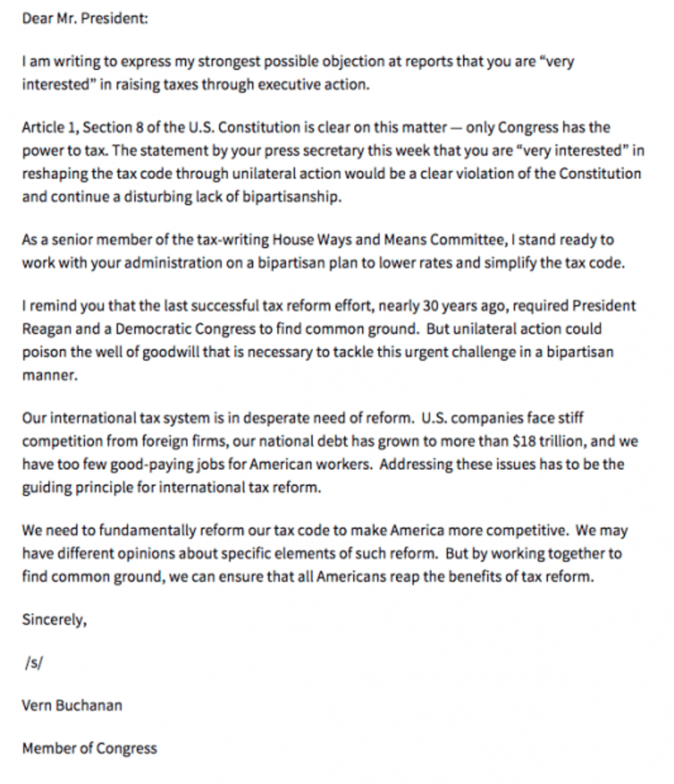 "Article 1, Section 8 of the U.S. Constitution is clear on this matter — only Congress has the power to tax," Rep. Vern Buchanan (R-Fla.) wrote in a Thursday letter to Obama. "The statement by your press secretary this week that you are 'very interested' in reshaping the tax code through unilateral action would be a clear violation of the Constitution and continue a disturbing lack of bipartisanship."