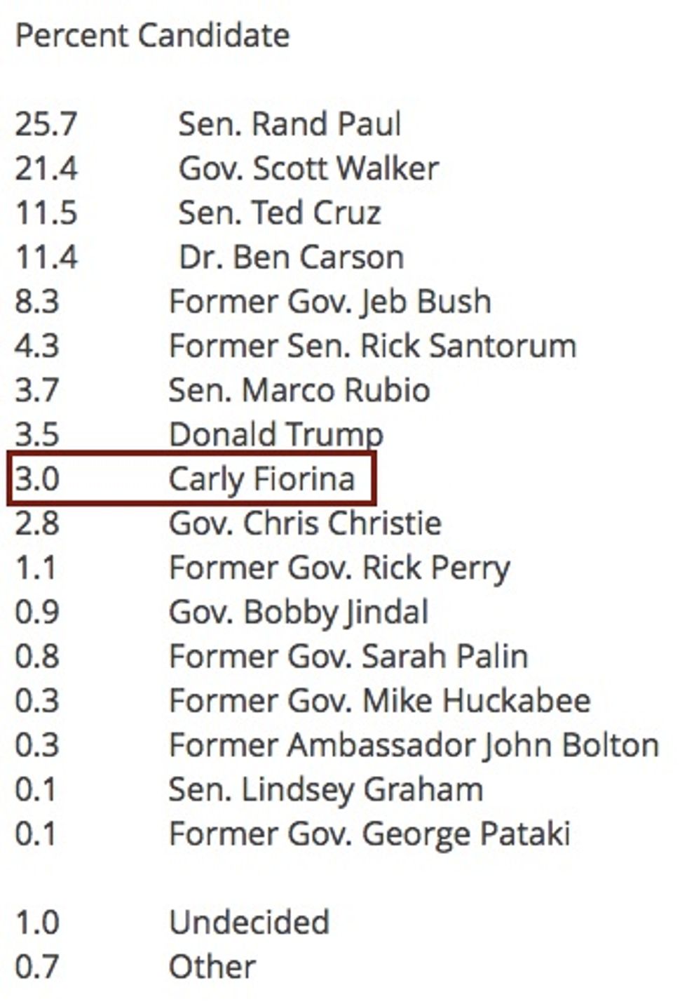 Ben Carson (fourth place) and Donald Trump (eighth place) may not be too surprising, as they are names regularly seen on television or in the news. However, finishing in ninth place was a relative political newcomer, Carly Fiorina. The former Hewlett-Packard CEO finished ahead of well-known political figures and former governors like Chris Christie, Rick Perry, Bobby Jindal and Sarah Palin.