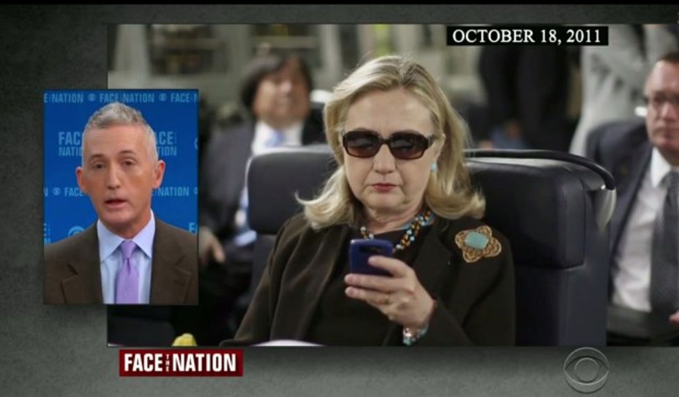 "There are gaps of months, and months, and months. And if you think to that iconic picture of her on a C-17 flying to Libya, she has sunglasses on and she has her handheld device in her hand — we have no emails from that day," Gowdy told CBS anchor Bob Schieffer on "Face the Nation" Sunday morning.