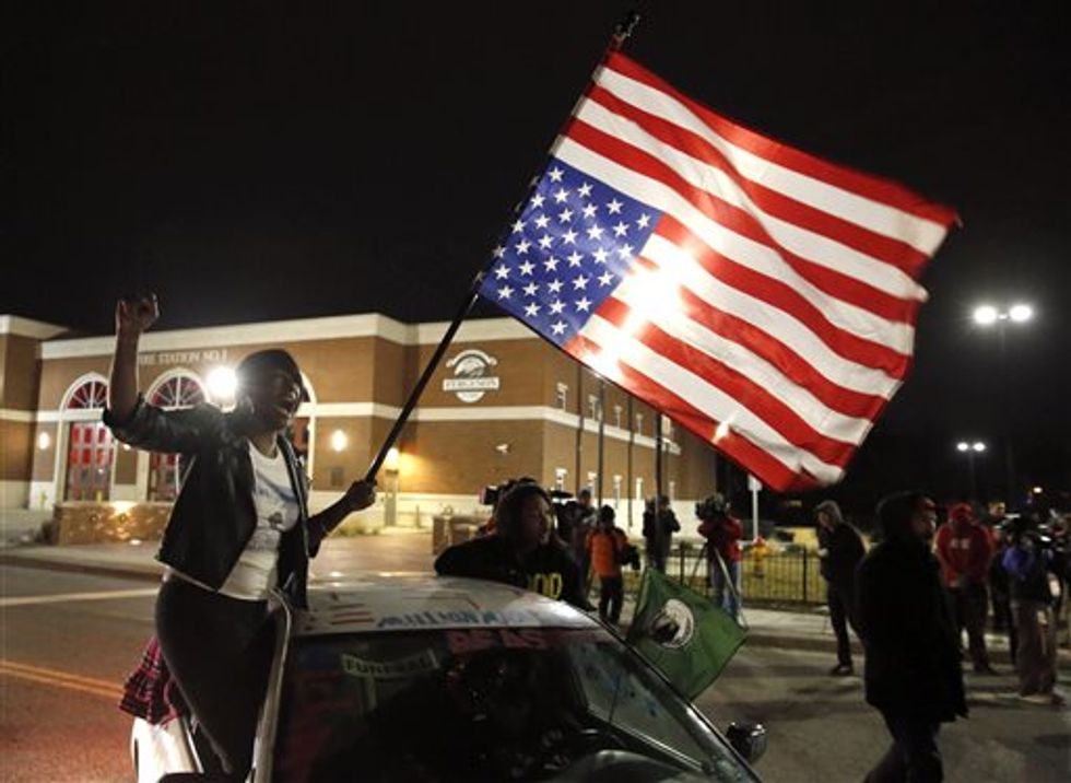 Gina Gowdy joins protesters on the street outside a Ferguson, Mo., fire station, Wednesday, March 4, 2015, in Ferguson. (AP Photo/Charles Rex Arbogast)