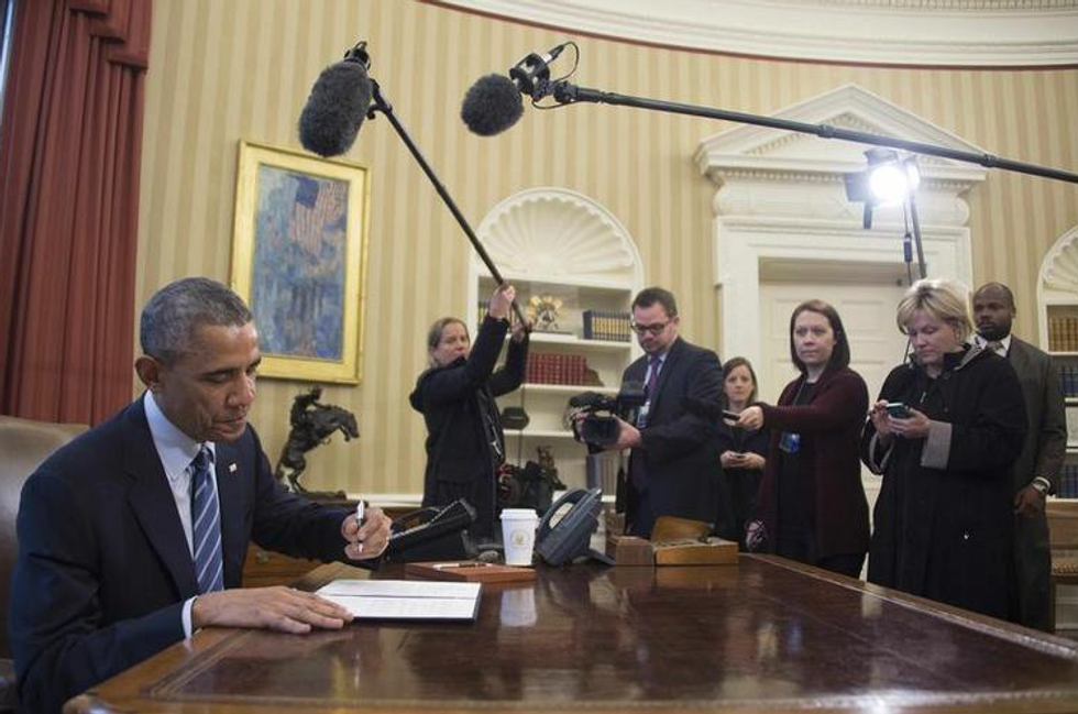 President Barack Obama (L)signs a presidential memorandum, a student aid bill of rights, in the Oval Office of the White House in Washington, DC, March 10, 2015. (AFP/Jim Watson)