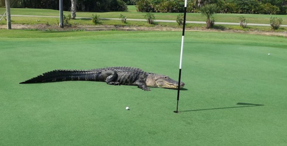 Last Friday, a group of golfers preparing to putt on the 7th hole when they allegedly spotted the massive gator making a beeline to the pond on the other side of the putting surface. It's said that they wisely gave the big guy plenty of room -- but did manage to snap a few photos as he lumbered towards the water.