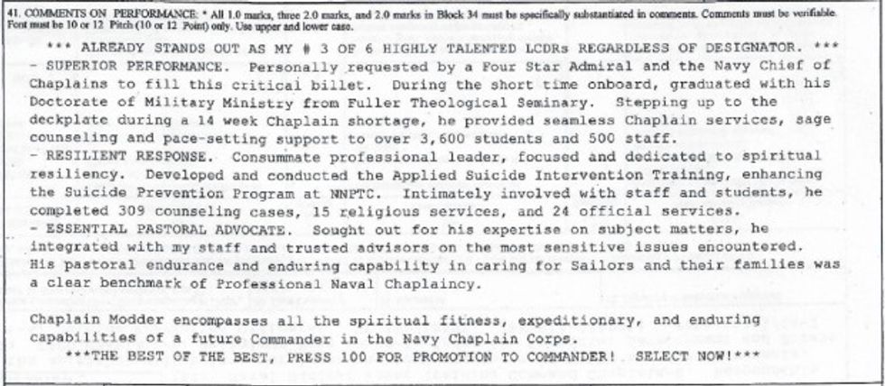 "[Modder] failed to show tolerance and respect for the rights of individuals to determine their own religious convictions as required by reference (b)," read a letter from Navy Capt. Jon Fahs. "On multiple occasions he discriminated against students who were of different faiths and backgrounds."