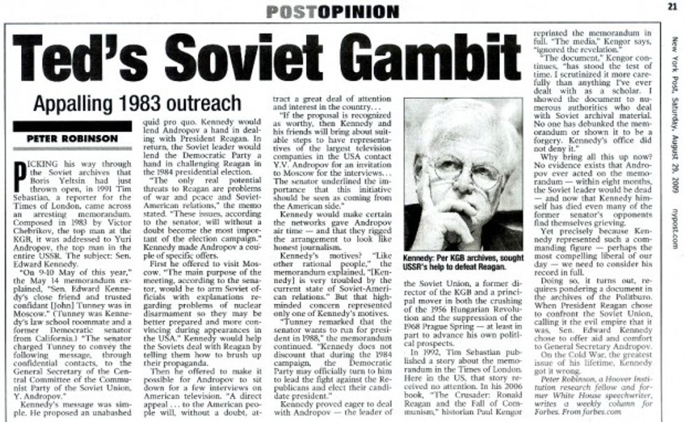 The Kennedy plan was only revealed after a treasure trove of documents from the dissolved Soviet empire was released. London Times reporter Tim Sebastian brought the story to the world in 1991, revealing a memo from then-KGB head Viktor Chebrikov to the Soviet leader, Yuri Andropov.