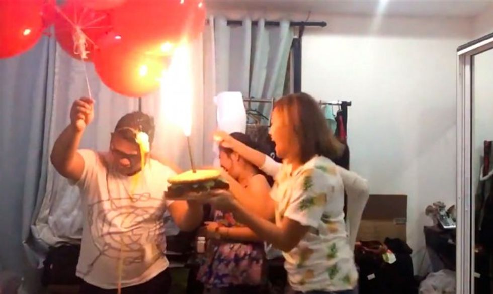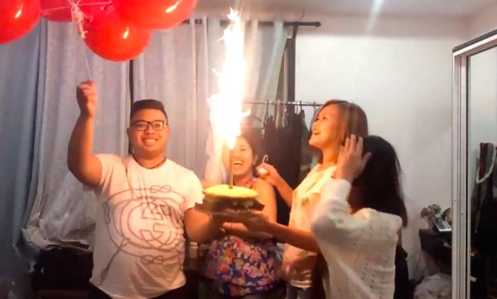 The unidentified birthday boy was holding the cake and posing for a photo when his companions splattered an egg on his head, which seemingly caused him to inadvertently move the balloons closer to the sparkler. It wasn't long before the balloons erupted into a giant flame.