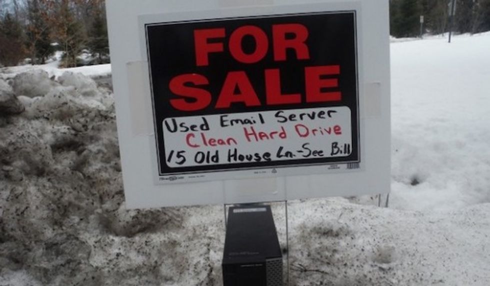A business owner in Chappaqua, New York, made headlines on Friday when he posted a “for sale” sign near former Secretary of State Hillary Clinton’s home advertising a “used email server” with a “clean hard drive.” Interested buyers were instructed to “see Bill.”
