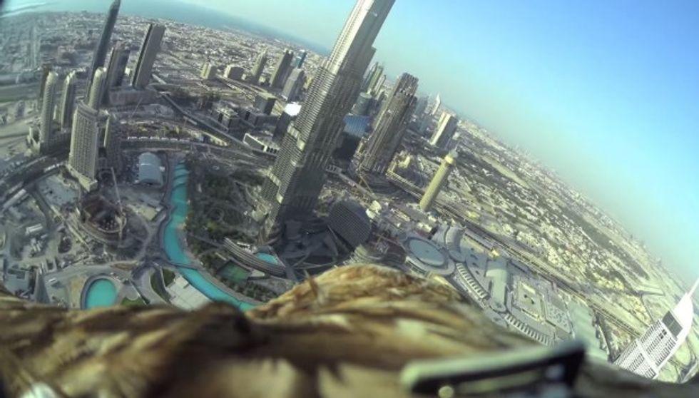 It's...a bird with a camera strapped to its back soaring from the tallest building in the world.