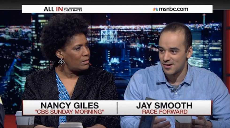 Hayes invited "CBS Sunday Morning" contributor Nancy Giles and DJ and online commentator Jay Smooth to discuss Starbucks' new "Race Together" initiative.