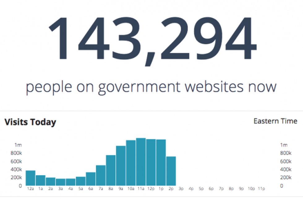 At first blush, federal websites appear to get reasonably healthy web traffic from users. The tool said there have been 1.35 billion visits by people over the last 90 days, and it said more than 140,000 people were on federal sites by mid-Thursday afternoon.