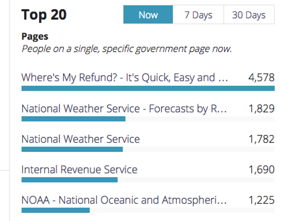 For example, the "Where's My Refund" web page at the IRS was the top page visited on Thursday. That page has also been the most popular over the last week and the last month, far out-performing other sites.