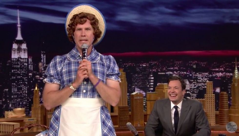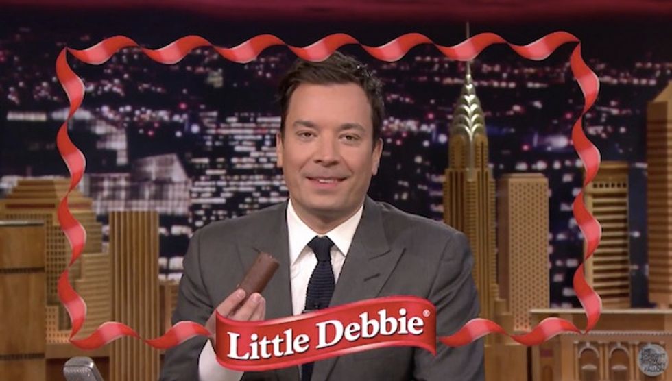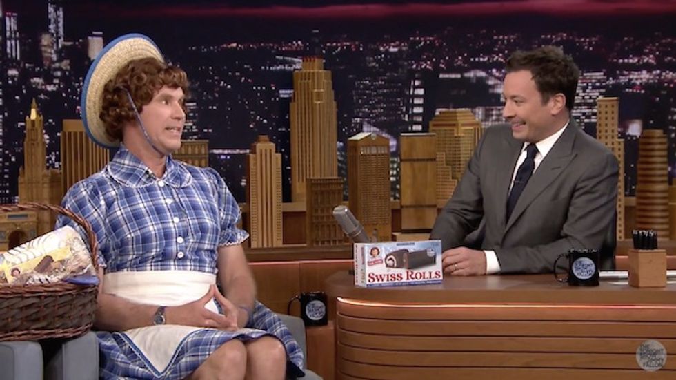 Just a day after appearing on David Letterman's show dressed as a leprechaun, Ferrell walked on stage for an appearance with Jimmy Fallon dressed exactly like "Little Debbie," the iconic character seen on the boxes of the popular snack cakes.