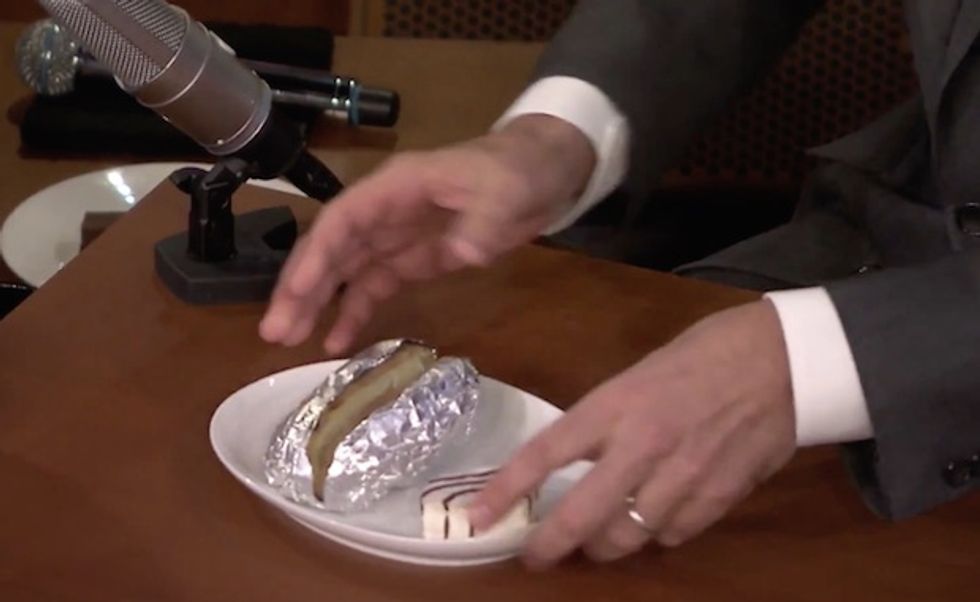 Fallon was ready for the challenge and produced a plate with a baked potato and a snack cake.