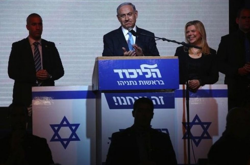 Israeli Prime Minister Benjamin Netanyahu delivers a speech next to his wife Sara as he reacts to exit poll figures in Israel's parliamentary elections late on March 17, 2015 in the city of Tel Aviv. (Menahem Kahana/AFP/Getty Images)