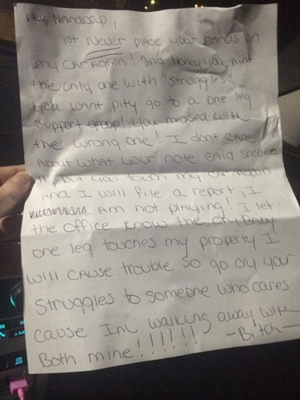 "Hey handicap! First, never place your hands on my car again! Second, honey you ain't the only one with "struggles." You want pity go to a one leg support group! You messed with the wrong one! I don't care what your note said shove it, but you touch my car again I will file a report, I am not playing! I let the office know the cry baby one leg touches my property I will cause trouble so go cry your struggles to someone who cares cause I'm walking away with both mine! -(b****)"