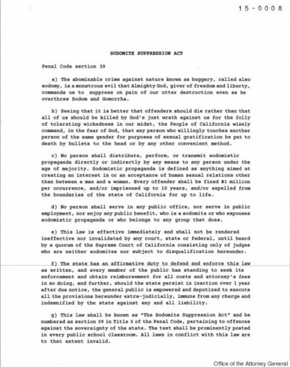 The "Sodomite Suppression Act," proposed by Huntington Beach, California, attorney Matt McLaughlin in February, is testing the Golden State's ballot initiative process.