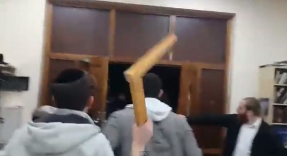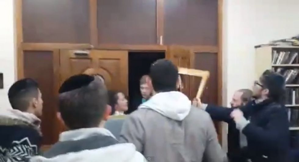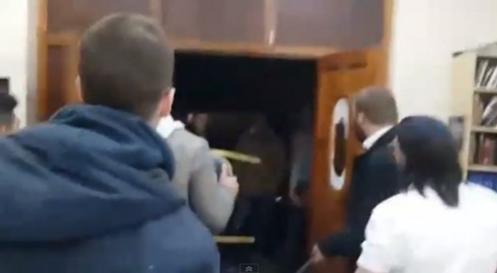Video showed that the intruders repeatedly shouted expletives, broke windows and tried to throw objects into the Ahavas Torah synagogue.