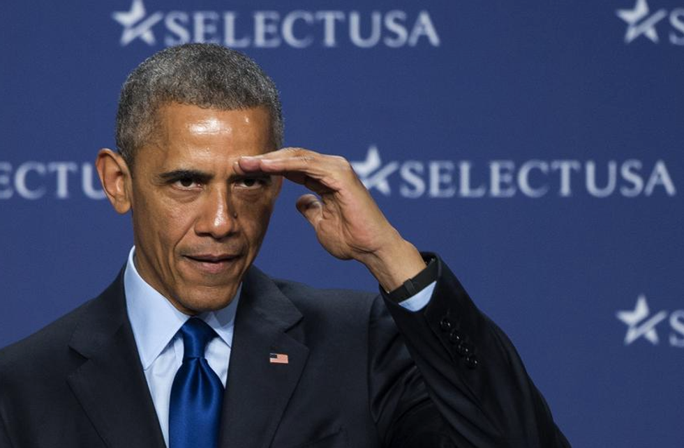 President Barack Obama looks into the audience while speaking at the SelectUSA Investment Summit, hosted by the Commerce Department, Monday, March 23, 2015, in National Harbor, Md. (AP Photo/Cliff Owen)
